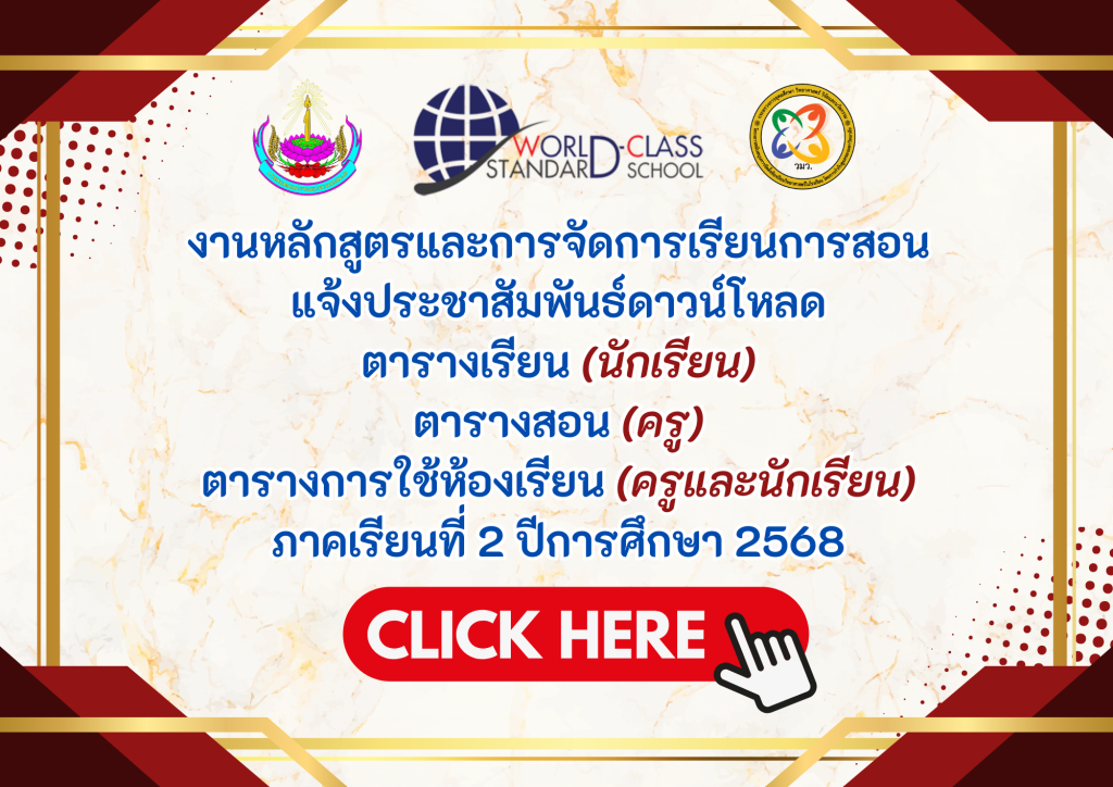 งานหลักสูตรและการจัดการเรียนการสอนแจ้งประชาสัมพันธ์ดาวน์โหลด ตารางเรียน (นักเรียน) ตารางสอน (ครู) ตารางการใช้ห้องเรียน (ครูและนักเรียน) ภาคเรียนที่ 2 ปีการศึกษา 2568