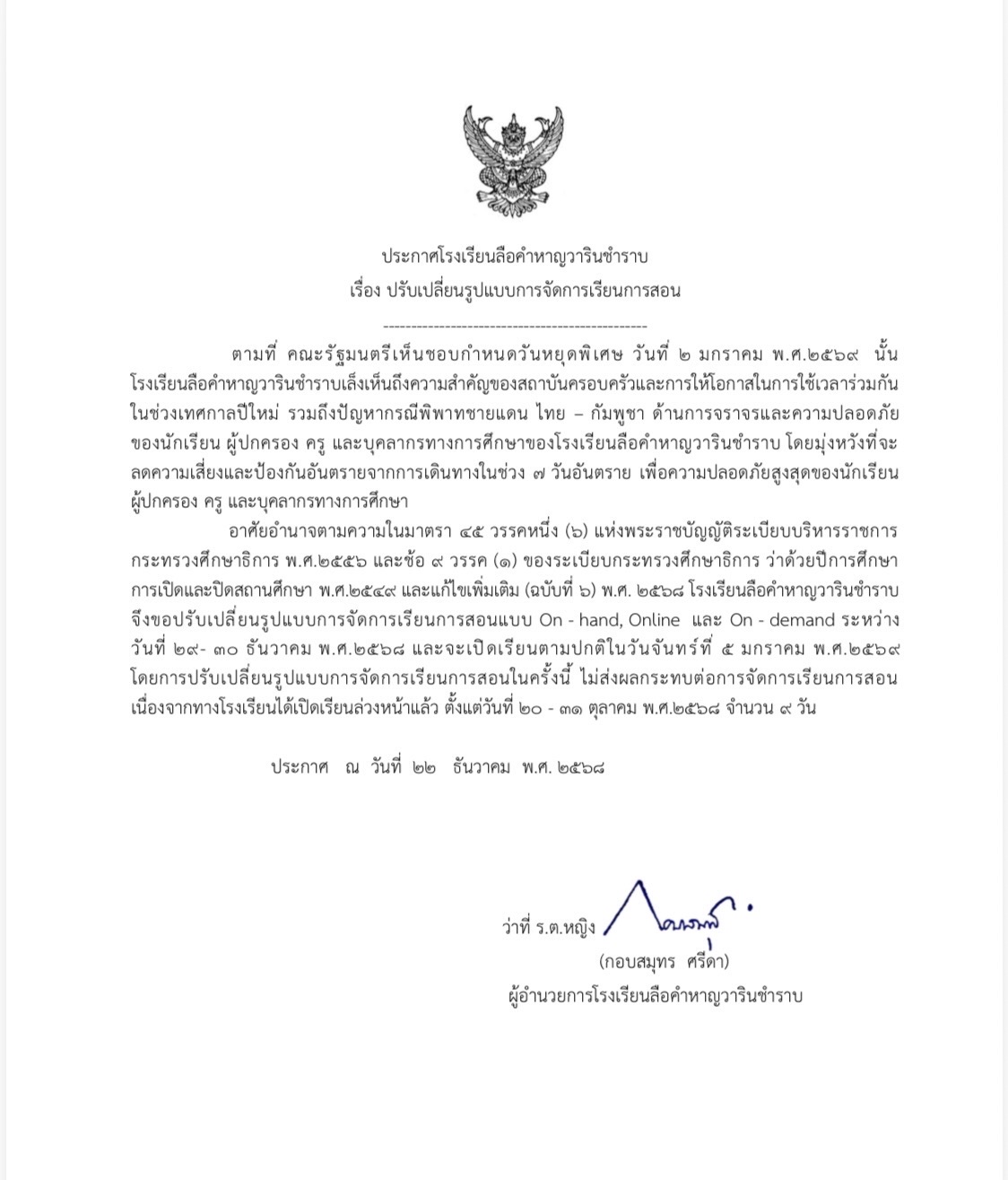 ประกาศโรงเรียนลือคำหาญวารินชำราบ เรื่อง ปรับเปลี่ยนรูปแบบการจัดการเรียนการสอน
