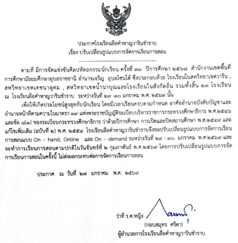 ข่าวประชาสัมพันธ์ ประกาศโรงเรียนลือคำหาญวารินชำราบ เรื่อง ปรับเปลี่ยนรูปแบบการจัดการเรียนการสอน ระหว่างวันที่ 29-30 ม.ค.2569 Posted on 27 มกราคม 202627 มกราคม 2026 by admin admin ประกาศโรงเรียนลือคำหาญวารินชำราบ เรื่อง ปรับเปลี่ยนรูปแบบการจัดการเรียนการสอน