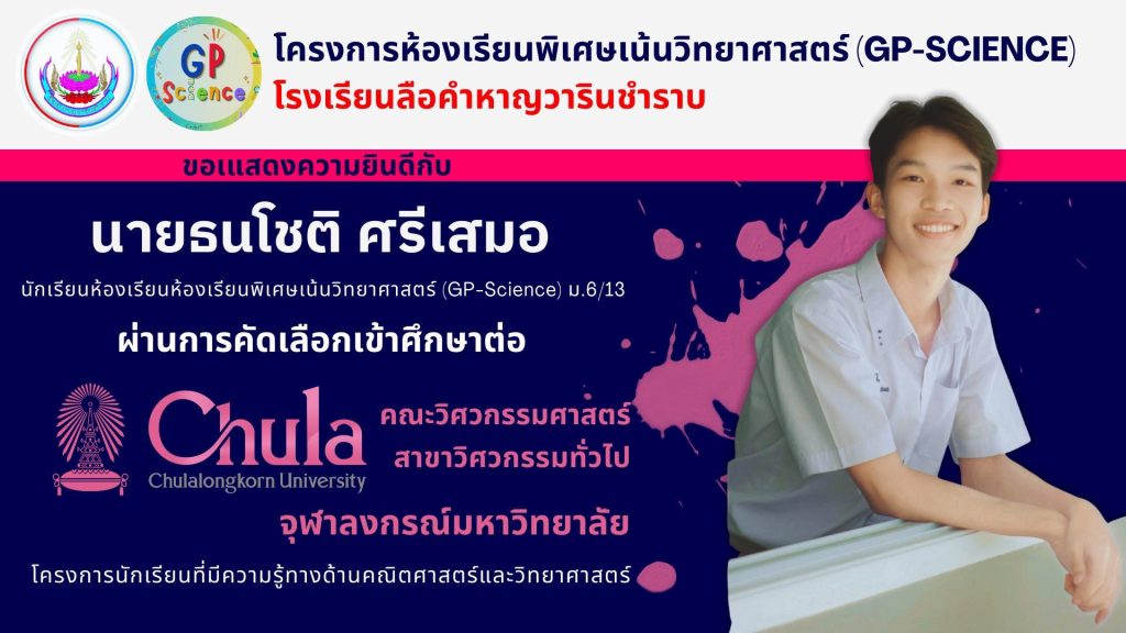 ขอเแสดงความยินดีกับ นายธนโชติ ศรีเสมอ นักเรียนห้องเรียนห้องเรียนพิเศษเน้นวิทยาศาสตร์ (GP-Science) ม.6/13